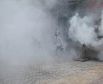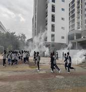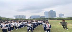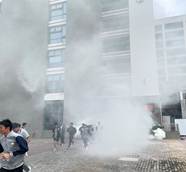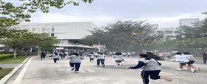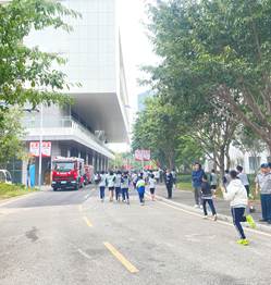 宿舍起火,浓烟滚滚。全体住宿生在驻校教官、各班班主任及物业维序员、工作人员的引导下,用湿毛巾捂住口鼻,弯腰低姿,沿着预定疏散路线,快速、有序地从宿舍撤离到田径场的安全地带集合清点人数,确保无一人遗漏,整个疏散演练过程高效且画面逼真。